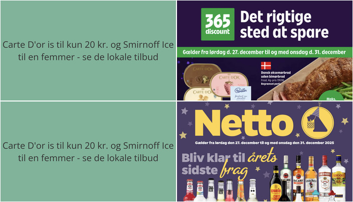 Netto har et uimodståeligt tilbud på Smirnoff Ice, hvor du kan få en flaske på 27,5 cl for kun 5 kr. Husk, der er en maxgrænse på 24 stk. pr. variant pr. kunde pr. dag til denne pris. Tilbuddet gælder fra lørdag den 27. december til onsdag den 31. december.