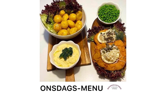 Beringsslagteren ApS tilbyder en onsdagsschnitzelmenu for to personer til 119,95 kr. Menuen inkluderer skinkeschnitzler, sommerkartofler, grønne ærter og bearnaisesauce. Bestilling skal ske senest onsdag den 5. februar kl. 10:00, og afhentning kan ske samme dag mellem 10:00 og 17:30. For mere information kan du læse det oprindelige opslag.